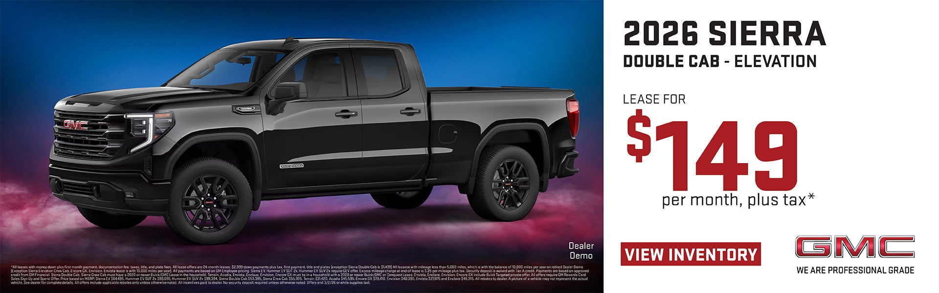 *All leases with money down plus first month payment, documentation fee, taxes, title, and plate fees. All lease offers are 24-month leases. $2,999 down payments plus tax, first payment, title and plates (exception Sierra Double Cab is $1,499). All leases with mileage less than 5,000 miles, which is with the balance of 10,000 miles per year on retired Dealer Demo (Exception Sierra Elevation Crew Cab, Encore GX, Envision, Envista lease is with 10,000 miles per year). All payments are based on GM Employee pricing. Sierra EV, Hummer EV SUT 2x, Hummer EV SUV 2x require GEV offer. Excess mileage charge at end of lease is $.25 per mileage plus tax. Security deposit is waived with Tier A credit. Payments are based on approved credit from GM Financial. Sierra Double Cab, Sierra Crew Cab must have a 2020 or newer Buick/GMC Lease in the household. Terrain, Acadia, Envista, Enclave, Envision, Encore GX must be in a household with a 2020 or newer Buick/GMC or Conquest Lease. Envista, Enclave, Envision, Encore GX include Buick Targeted private offer. All offers require GM Rewards Card Sales Sign Up and Spend Offer. Price based on MSRP: Sierra EV $64,495, Hummer EV SUT 2x $99,095, Hummer EV SUV 2x $99,394, Sierra Double Cab $53,395, Sierra Crew Cab $55,995, Terrain $31,420, Acadia $45,595, Encore GX $29,410, Envision $40,390, Envista $27,875 and Enclave $49,315. All rebates to dealer. A picture of a vehicle may not represent the actual vehicle. See dealer for complete details. All offers include applicable rebates only unless otherwise noted. All incentives paid to dealer. No security deposit required unless otherwise noted. Offers end 3/2/26 or while supplies last.
