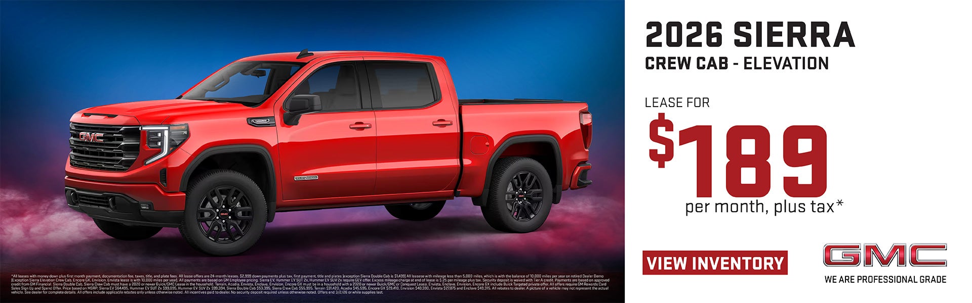 *All leases with money down plus first month payment, documentation fee, taxes, title, and plate fees. All lease offers are 24-month leases. $2,999 down payments plus tax, first payment, title and plates (exception Sierra Double Cab is $1,499). All leases with mileage less than 5,000 miles, which is with the balance of 10,000 miles per year on retired Dealer Demo (Exception Sierra Elevation Crew Cab, Encore GX, Envision, Envista lease is with 10,000 miles per year). All payments are based on GM Employee pricing. Sierra EV, Hummer EV SUT 2x, Hummer EV SUV 2x require GEV offer. Excess mileage charge at end of lease is $.25 per mileage plus tax. Security deposit is waived with Tier A credit. Payments are based on approved credit from GM Financial. Sierra Double Cab, Sierra Crew Cab must have a 2020 or newer Buick/GMC Lease in the household. Terrain, Acadia, Envista, Enclave, Envision, Encore GX must be in a household with a 2020 or newer Buick/GMC or Conquest Lease. Envista, Enclave, Envision, Encore GX include Buick Targeted private offer. All offers require GM Rewards Card Sales Sign Up and Spend Offer. Price based on MSRP: Sierra EV $64,495, Hummer EV SUT 2x $99,095, Hummer EV SUV 2x $99,394, Sierra Double Cab $53,395, Sierra Crew Cab $55,995, Terrain $31,420, Acadia $45,595, Encore GX $29,410, Envision $40,390, Envista $27,875 and Enclave $49,315. All rebates to dealer. A picture of a vehicle may not represent the actual vehicle. See dealer for complete details. All offers include applicable rebates only unless otherwise noted. All incentives paid to dealer. No security deposit required unless otherwise noted. Offers end 3/2/26 or while supplies last.