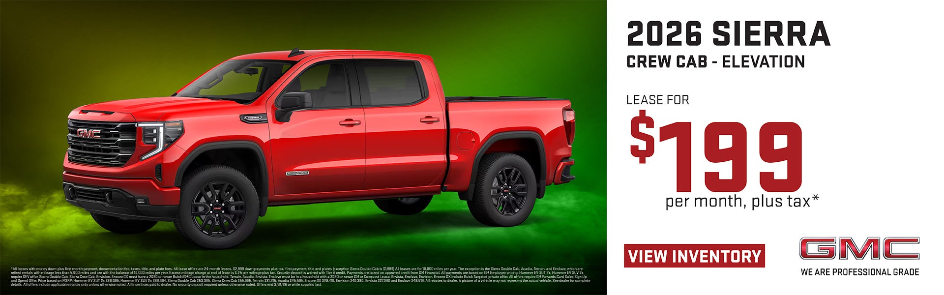 *All leases with money down plus first month payment, documentation fee, taxes, title, and plate fees. All lease offers are 24-month leases. $2,999 down payments plus tax, first payment, title and plates (exception Sierra Double Cab is $1,999) All leases are for 10,000 miles per year. The exception is the Sierra Double Cab, Acadia, Terrain, and Enclave, which are retired rentals with mileage less than 5,000 miles and are with the balance of 10,000 miles per year. Excess mileage charge at end of lease is $.25 per mileage plus tax. Security deposit is waived with Tier A credit. Payments are based on approved credit from GM Financial. All payments are based on GM Employee pricing. Hummer EV SUT 2x, Hummer EV SUV 2x require GEV offer. Sierra Double Cab, Sierra Crew Cab, Envision, Encore GX must have a 2020 or newer Buick/GMC Lease in the household. Terrain, Acadia, Envista, Enclave must be in a household with a 2020 or newer GM or Conquest Lease. Envista, Enclave, Envision, Encore GX include Buick Targeted private offer. All offers require GM Rewards Card Sales Sign Up and Spend Offer. Price based on MSRP: Hummer EV SUT 2x $99,095, Hummer EV SUV 2x $99,394, Sierra Double Cab $53,395, Sierra Crew Cab $55,995, Terrain $31,915, Acadia $45,595, Encore GX $29,410, Envision $40,390, Envista $27,380 and Enclave $48,519. All rebates to dealer. A picture of a vehicle may not represent the actual vehicle. See dealer for complete details. All offers include applicable rebates only unless otherwise noted. All incentives paid to dealer. No security deposit required unless otherwise noted. Offers end 3/31/26 or while supplies last.