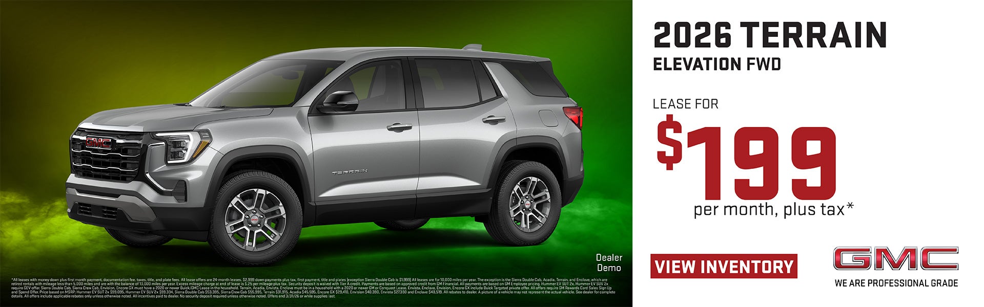 *All leases with money down plus first month payment, documentation fee, taxes, title, and plate fees. All lease offers are 24-month leases. $2,999 down payments plus tax, first payment, title and plates (exception Sierra Double Cab is $1,999) All leases are for 10,000 miles per year. The exception is the Sierra Double Cab, Acadia, Terrain, and Enclave, which are retired rentals with mileage less than 5,000 miles and are with the balance of 10,000 miles per year. Excess mileage charge at end of lease is $.25 per mileage plus tax. Security deposit is waived with Tier A credit. Payments are based on approved credit from GM Financial. All payments are based on GM Employee pricing. Hummer EV SUT 2x, Hummer EV SUV 2x require GEV offer. Sierra Double Cab, Sierra Crew Cab, Envision, Encore GX must have a 2020 or newer Buick/GMC Lease in the household. Terrain, Acadia, Envista, Enclave must be in a household with a 2020 or newer GM or Conquest Lease. Envista, Enclave, Envision, Encore GX include Buick Targeted private offer. All offers require GM Rewards Card Sales Sign Up and Spend Offer. Price based on MSRP: Hummer EV SUT 2x $99,095, Hummer EV SUV 2x $99,394, Sierra Double Cab $53,395, Sierra Crew Cab $55,995, Terrain $31,915, Acadia $45,595, Encore GX $29,410, Envision $40,390, Envista $27,380 and Enclave $48,519. All rebates to dealer. A picture of a vehicle may not represent the actual vehicle. See dealer for complete details. All offers include applicable rebates only unless otherwise noted. All incentives paid to dealer. No security deposit required unless otherwise noted. Offers end 3/31/26 or while supplies last.